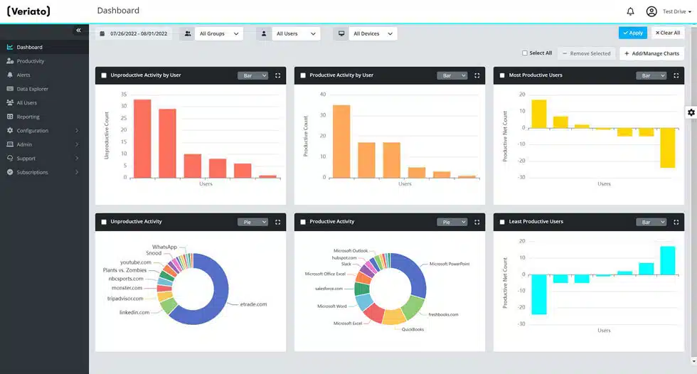 Veriatooffers preprogrammed productivity reports and a customizable report generator, enabling you to access the information you need. With group overviews and drill-down capabilities, Veriato empowers you to conduct powerful and efficient productivity analysis.